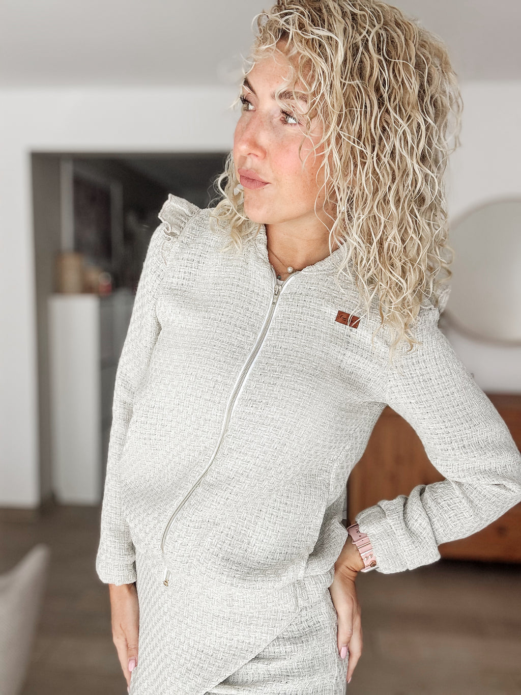 Penelope- eine in diesem Fall  Blousonjacke aus Jaquard, einem goldenen Reißverschluss und veganem Emblem. Diese Highlights und die faire Produktion machen diese Jacke zu einem echten und moralisch vertretbarem Luxusartikel. Fünf von Zehn Personen werden dich sicher auf diese Jacke ansprechen, dem Rest hat es die Sprache verschlagen. Du bist es Wert!